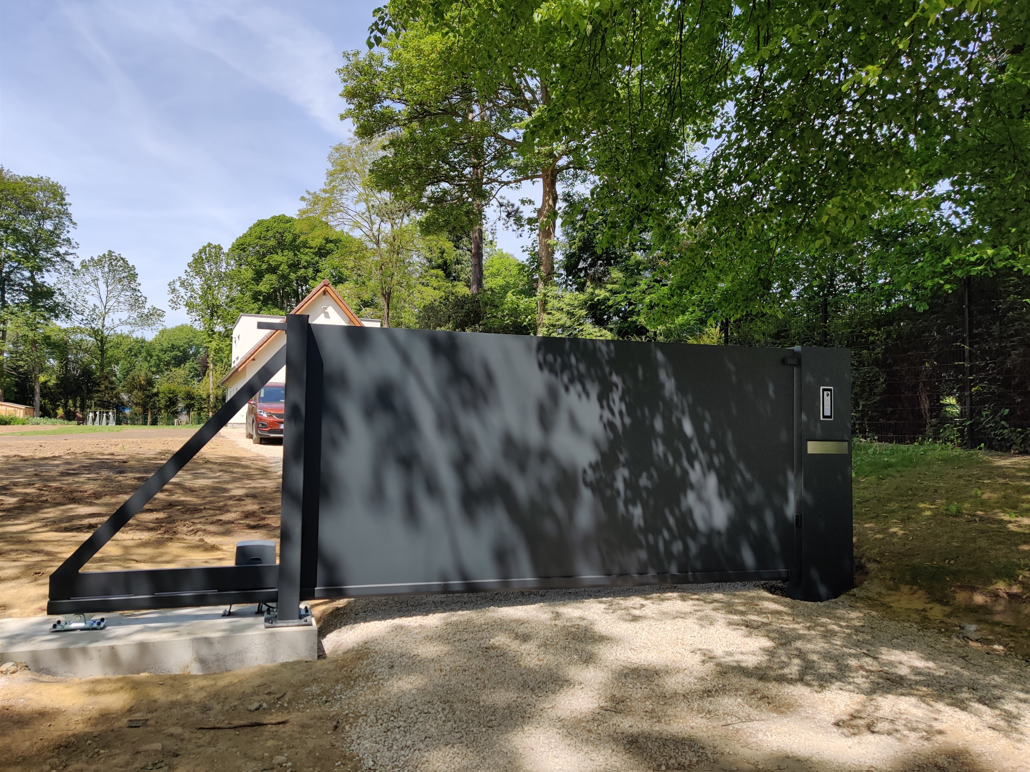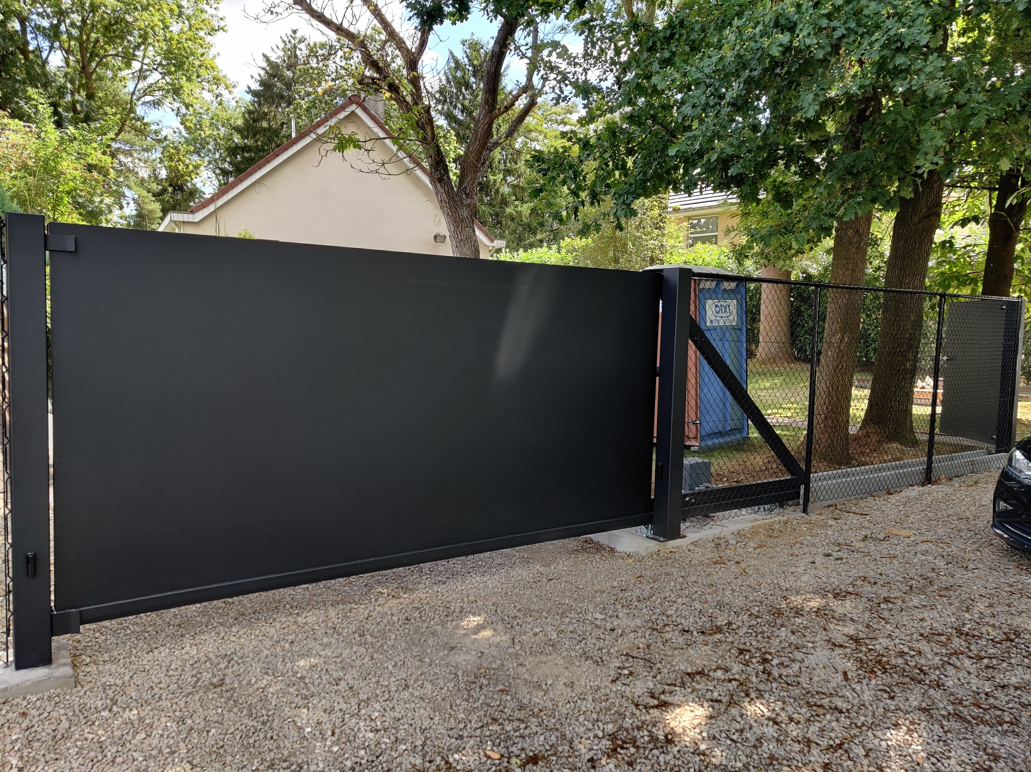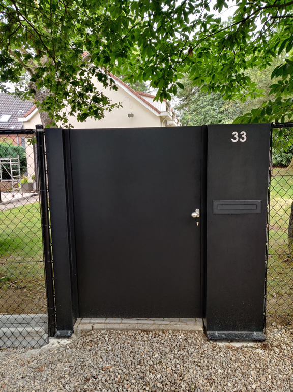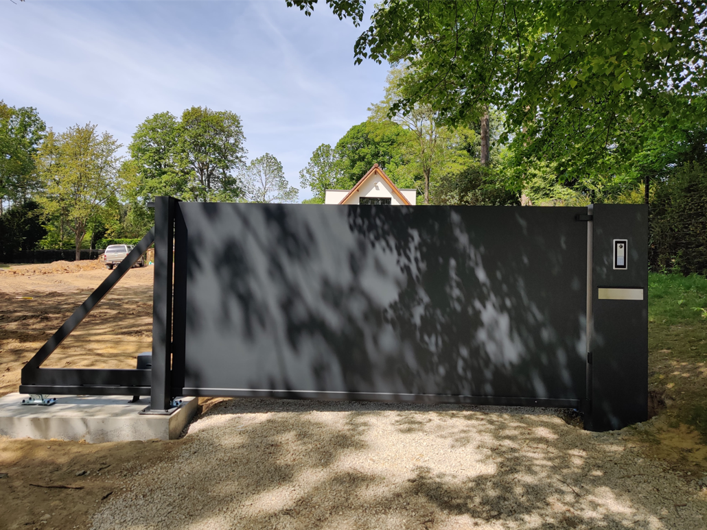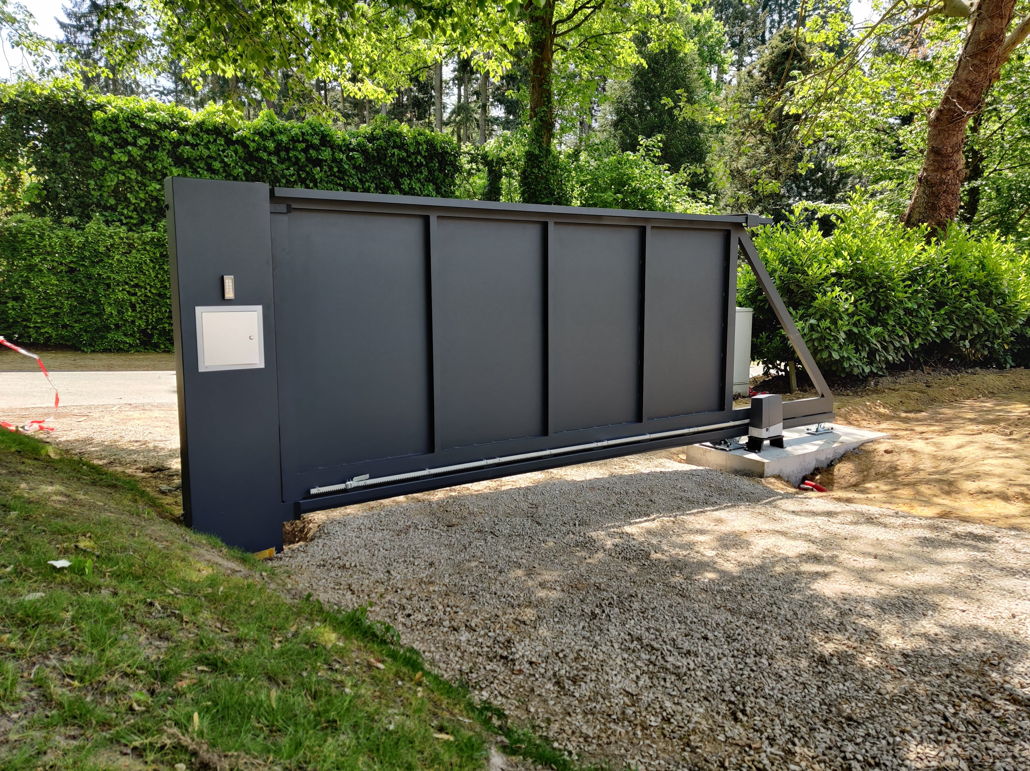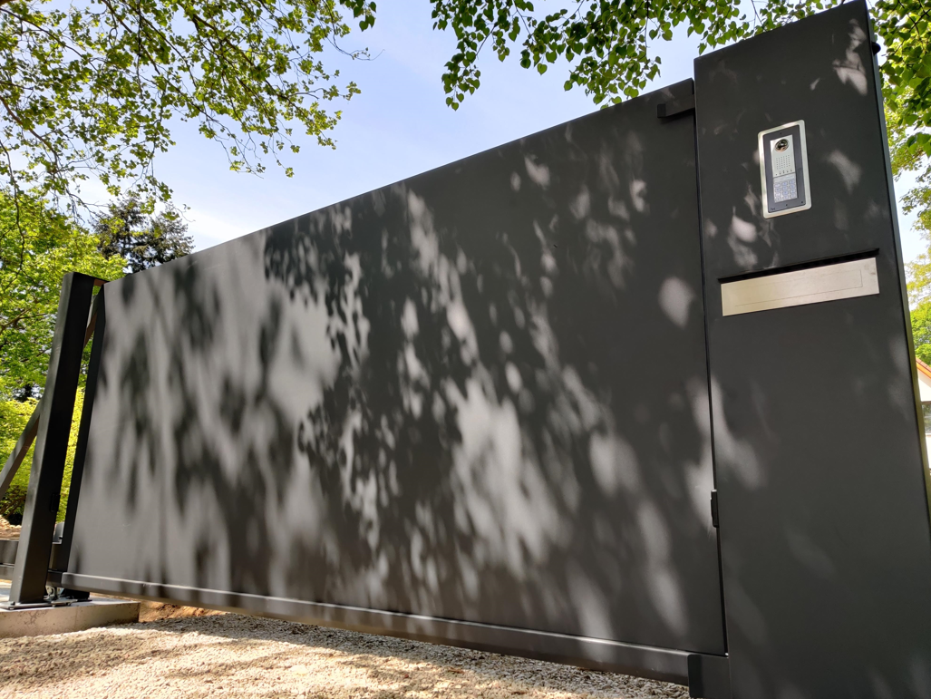 De Oslo design poort wordt bekleed met een aluminium paneel dat uit 1 stuk bestaat, ongeacht de grootte van de poort (tot max. 4x2m).