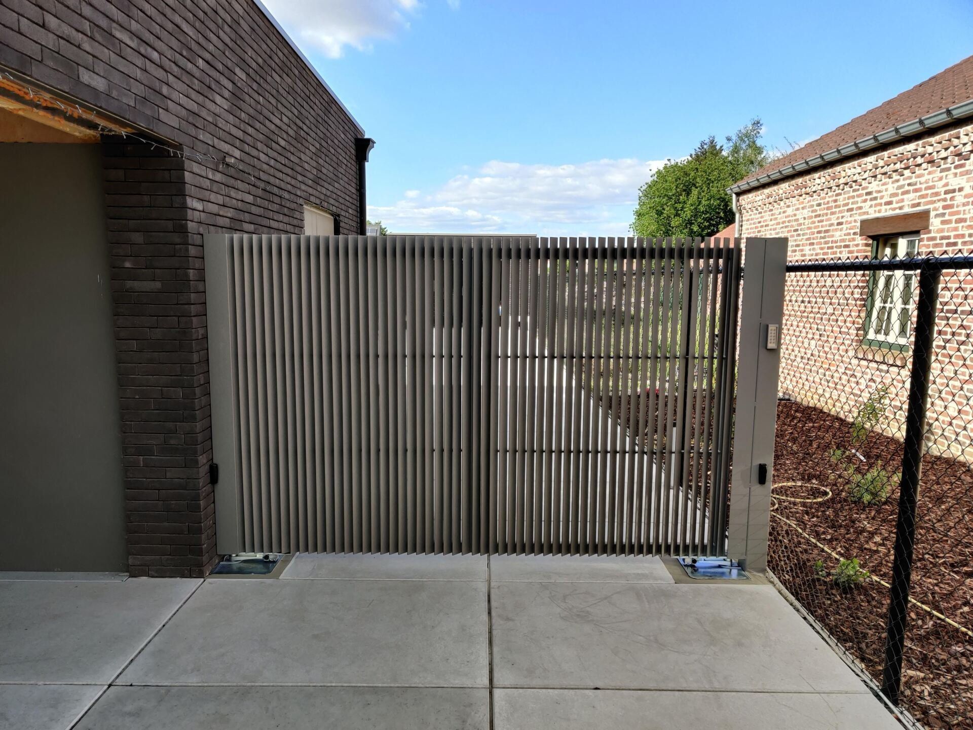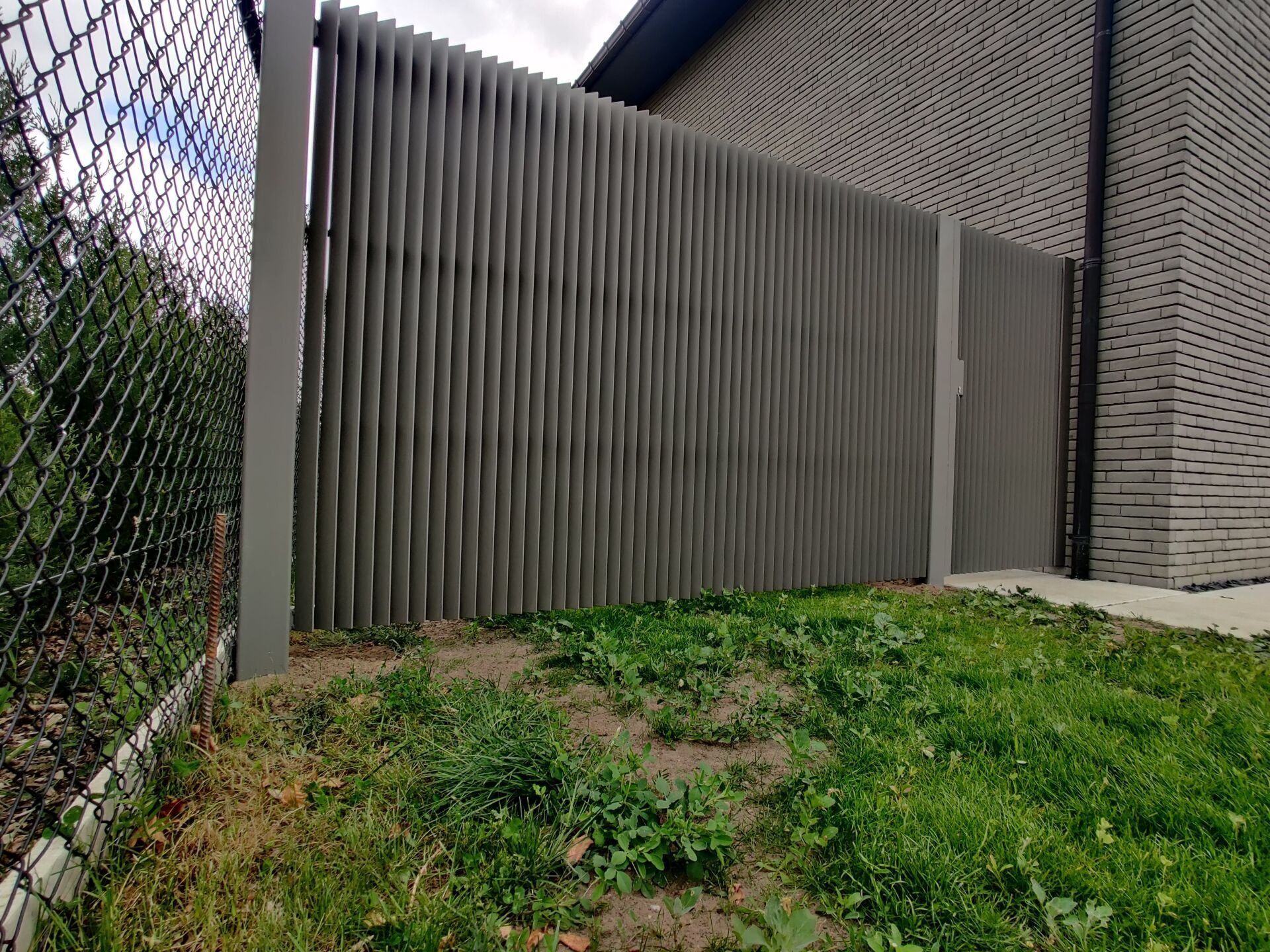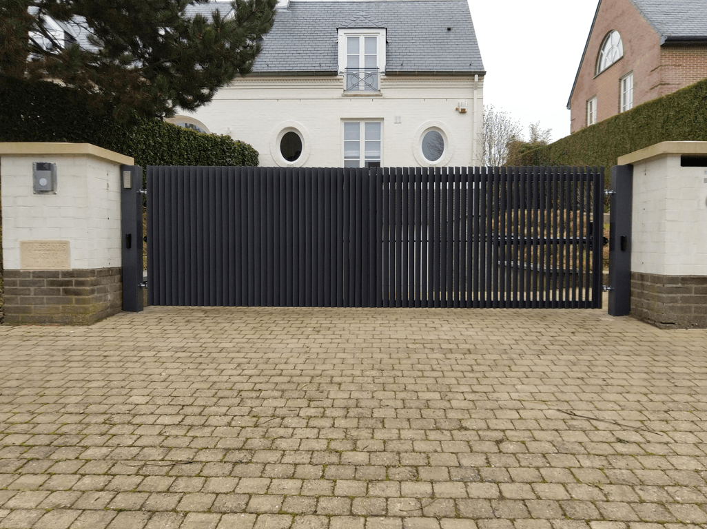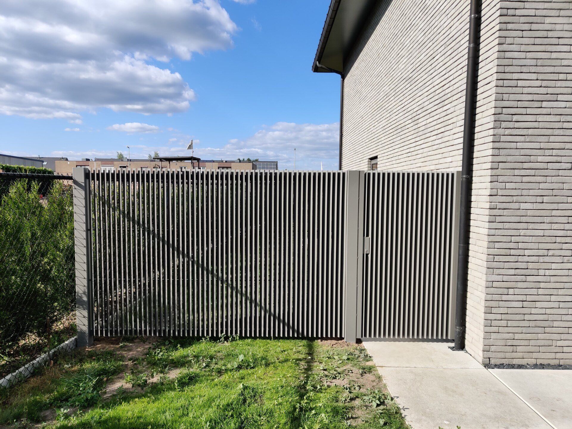 De onderstaande Top York design poort bestaat uit een kaderwerk met voorliggend lattenwerk, gelast onder 45° om inkijk langs de gekozen zijde te voorkomen.