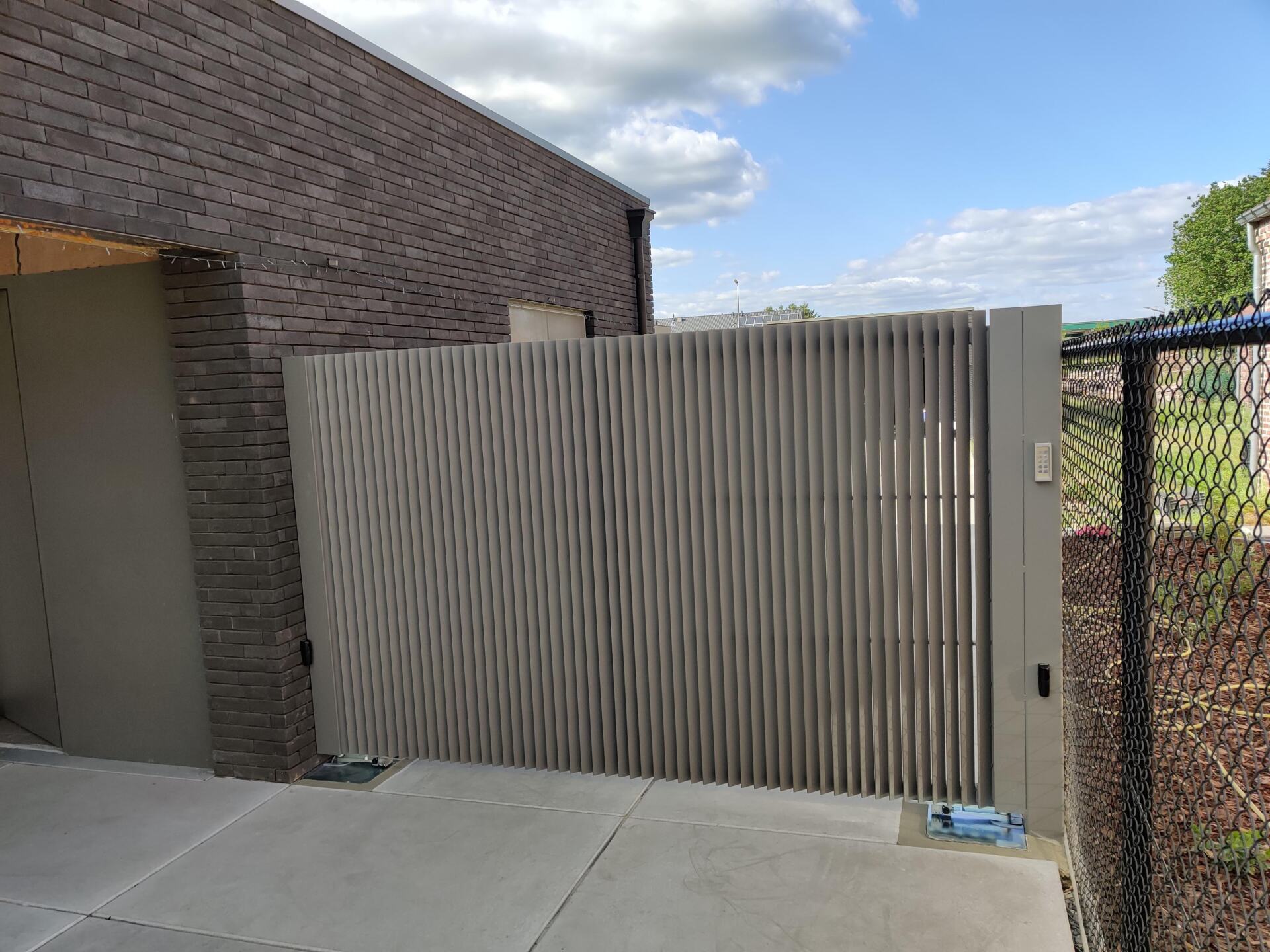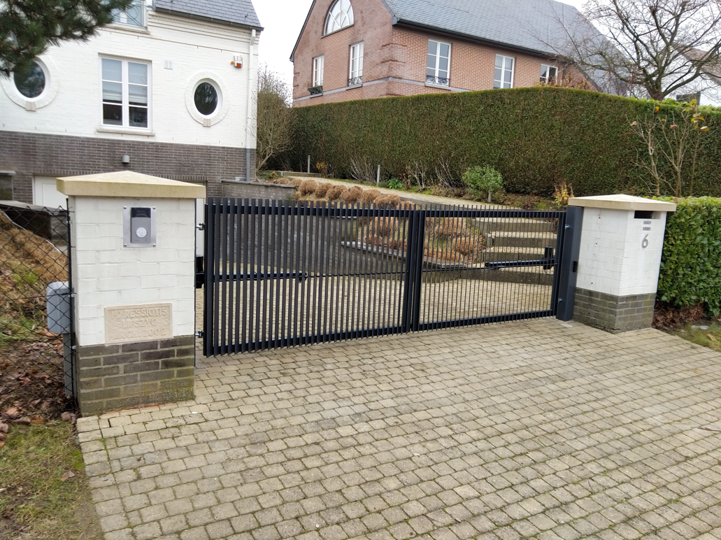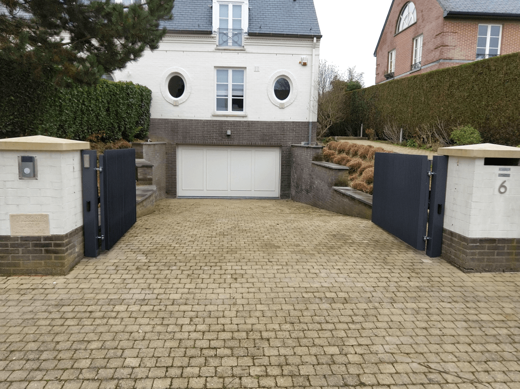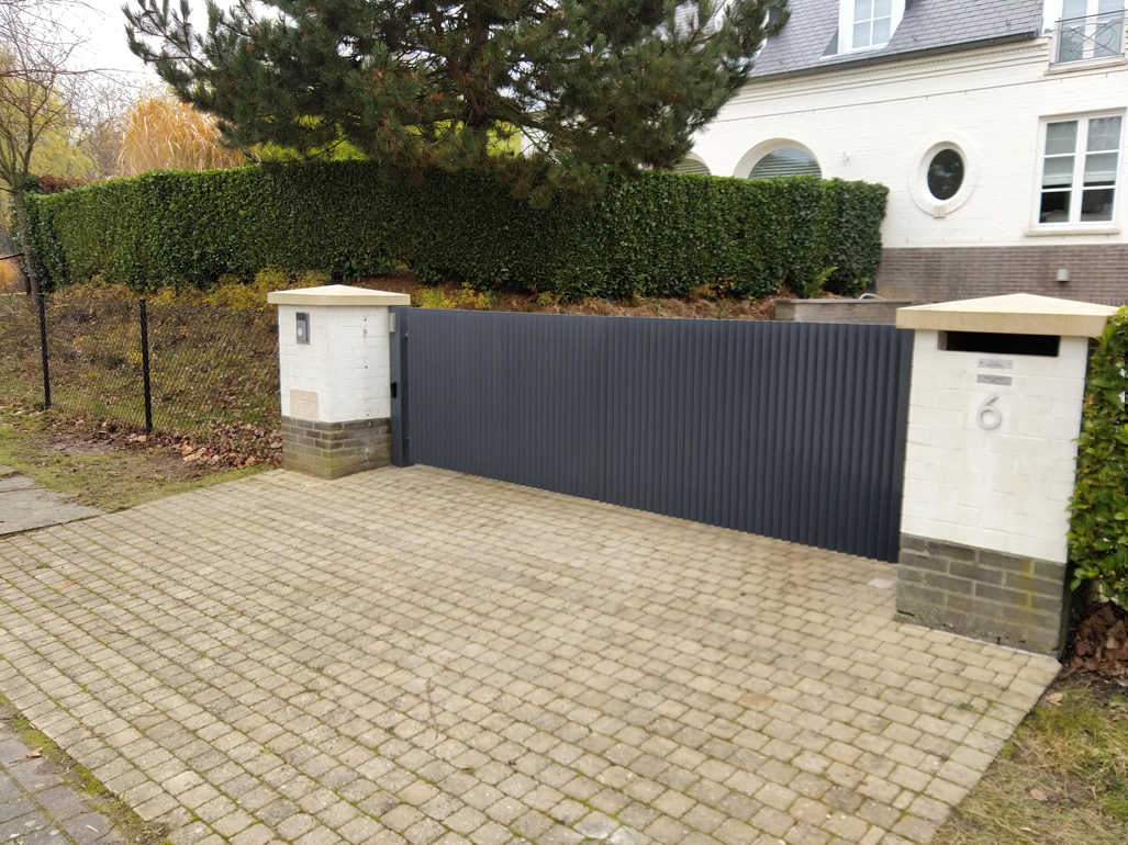 De onderstaande Top York design poort bestaat uit een kaderwerk met voorliggend lattenwerk, gelast onder 45° om inkijk langs de gekozen zijde te voorkomen.
